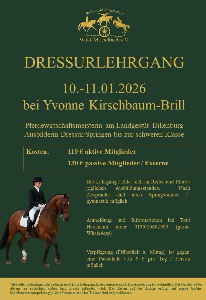 Der Reit- und Fahrverein Wald-Michelbach freut sich, auch im kommenden Jahr wieder Yvonne Kirschbaum-Brill für einen Dressurlehrgang begrüßen zu dürfen. Viele kennen sie bereits aus den vergangenen Jahren. Sie ist unter anderem als reiterliche Leitung des Landgestüts Dillenburg bekannt und als Pferdewirtschaftsmeisterin Reiten seit vielen Jahren in der Ausbildung von Pferden und Reitern aktiv.