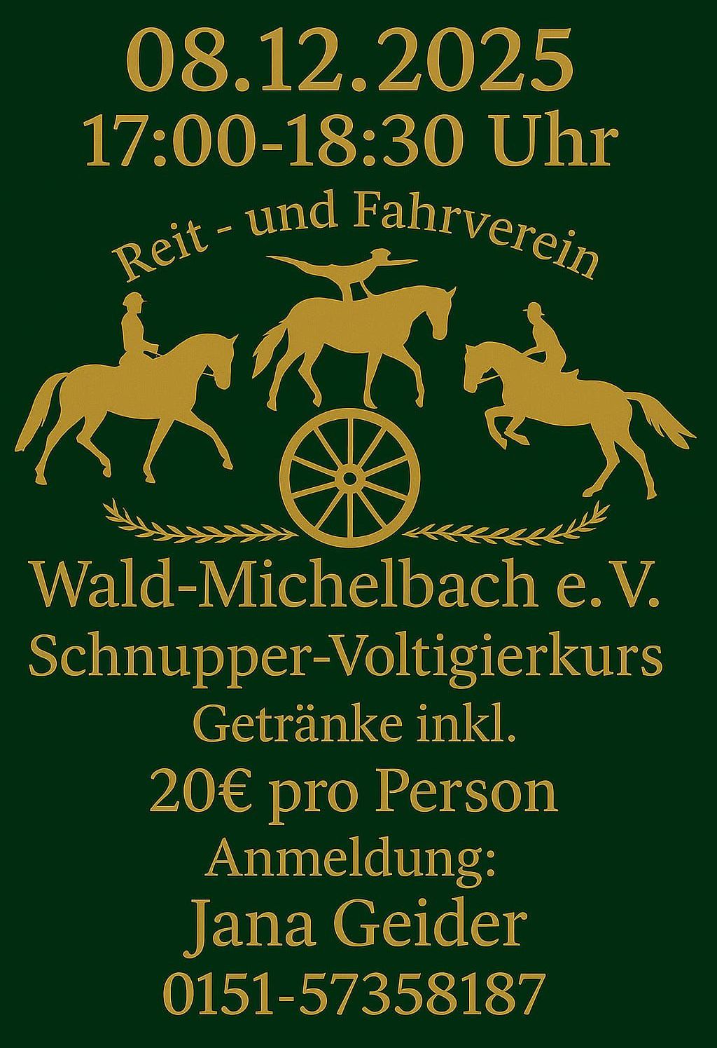 Am 08. Dezember 2025 bietet der Reit- und Fahrverein Wald-Michelbach e.V einen Schnupperkurs im Voltigieren an. Von 17:00 bis 18:30 Uhr können interessierte Kinder und Jugendliche erste Erfahrungen im Turnen auf dem Pferd sammeln. Der Kurs eignet sich sowohl für Anfänger als auch für Neugierige, die den Sport einfach einmal ausprobieren möchten.